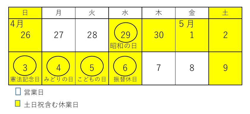 ゴールデンウィーク休業のおしらせ 投稿日:2026/04/22 お客様各位 平素は格別のご高配を賜り厚く御礼を申し上げます。 誠に勝手ながら、弊社では下記の日程を休業とさせて頂きます。 ご迷惑をお掛けするとは存じますが、何卒ご了承賜りますようお願い申し上げます。 ■ゴールデンウィーク休業期間 2026年4月29日(水)~ 2026年5月6日(水) ※2026年5月7日(木)より通常通り営業致します 前の記事へ HOME